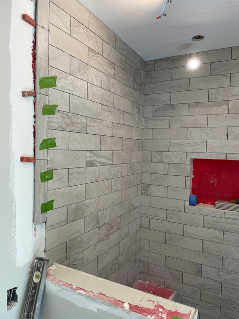 The tiling has begun! Custom Touch Builders is using a porcelain subway tile from floor to ceiling. New recessed lighting in the bathroom and shower are wired adding more light to the space. Check back soon for more updates.