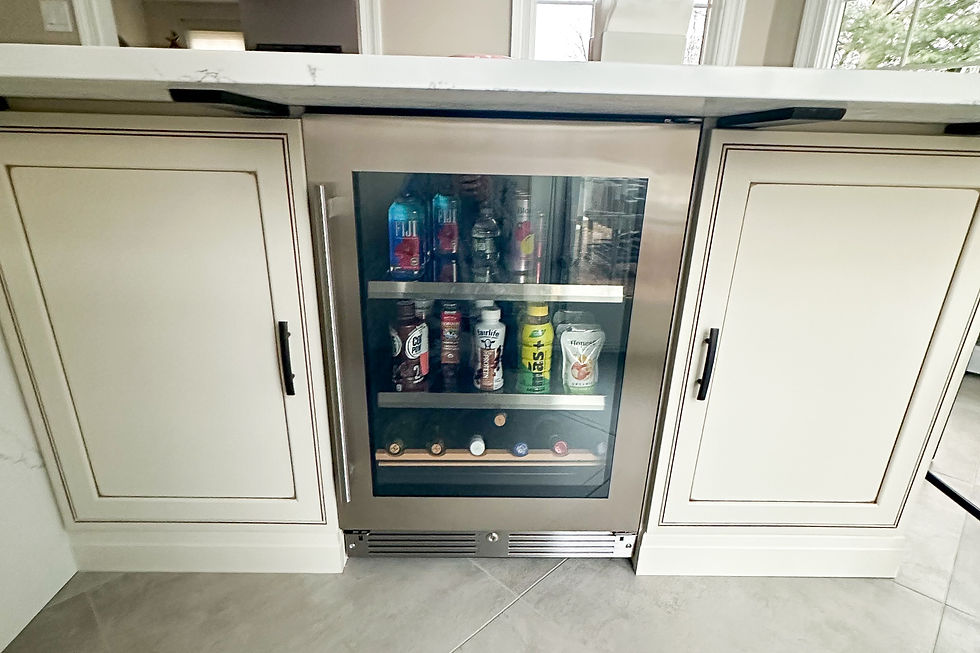 This kitchen renovation focused on clean lines, cohesive materials, and everyday functionality. Updated cabinetry in a soft neutral tone was paired with black hardware for contrast, while marble-inspired surfaces were carried throughout the island, backsplash, and custom range hood to create visual continuity. The layout was refined to improve flow and usability, with integrated appliances and a built-in beverage refrigerator added for convenience. Large windows and a light tile floor keep the space bright and balanced, resulting in a kitchen that feels intentional, practical, and thoughtfully updated without losing a classic feel.